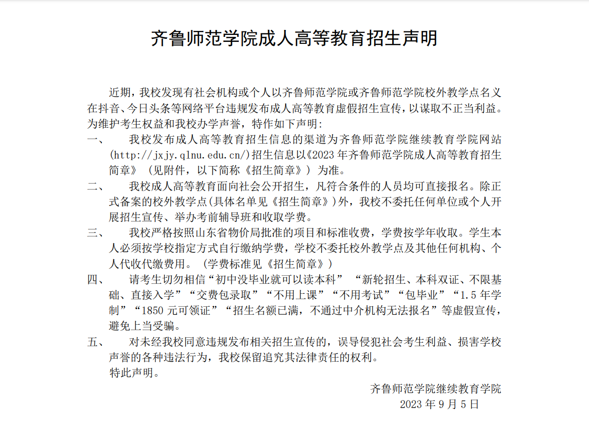 齐鲁师范学院成人高等教育招生声明