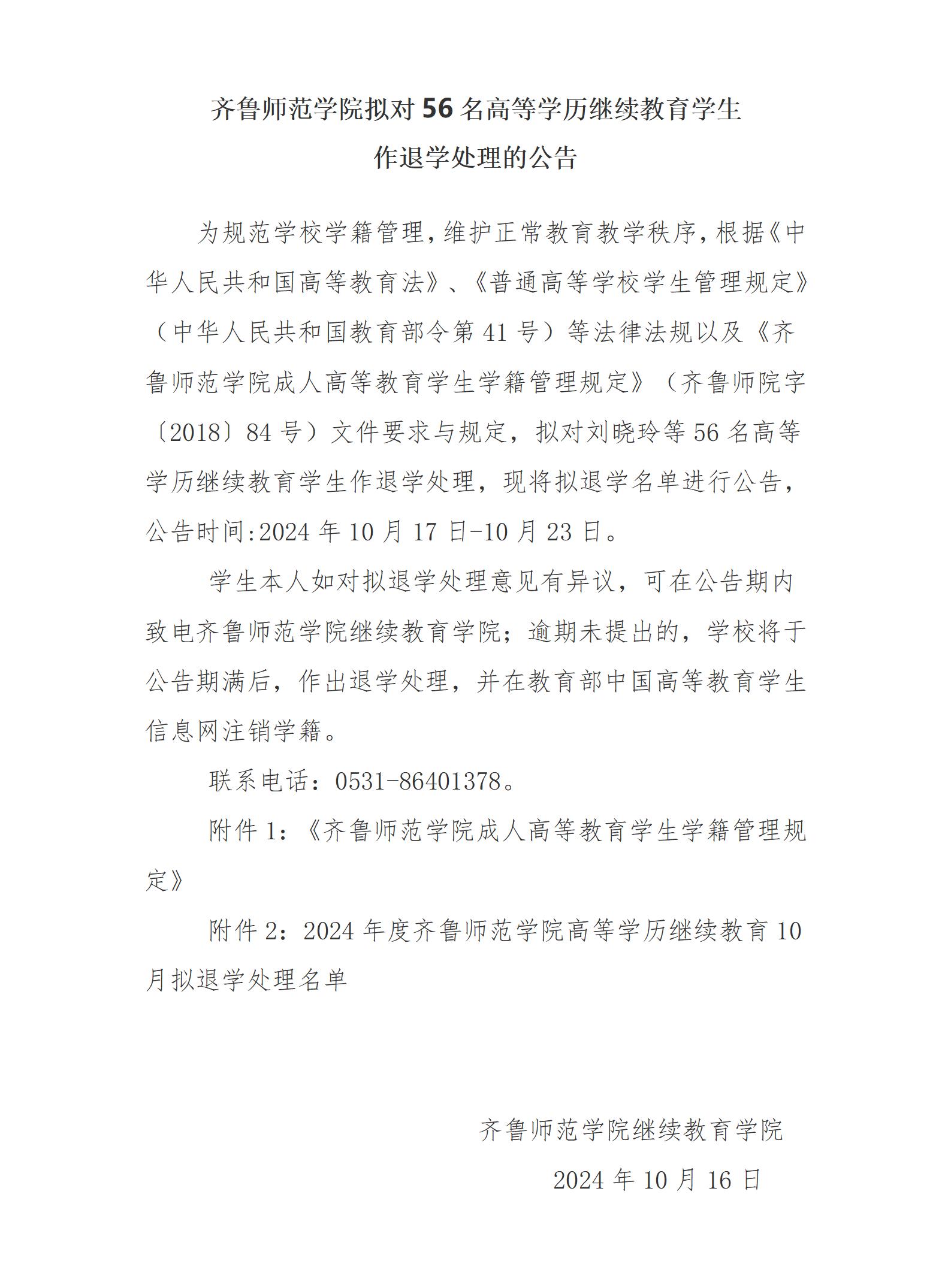 齐鲁师范学院拟对56名高等学历继续教育学生作退学处理的公告