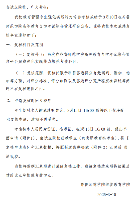 关于齐鲁师范学院2025年4月高等教育自学考试强化实践能力培养考核成绩复核的通知