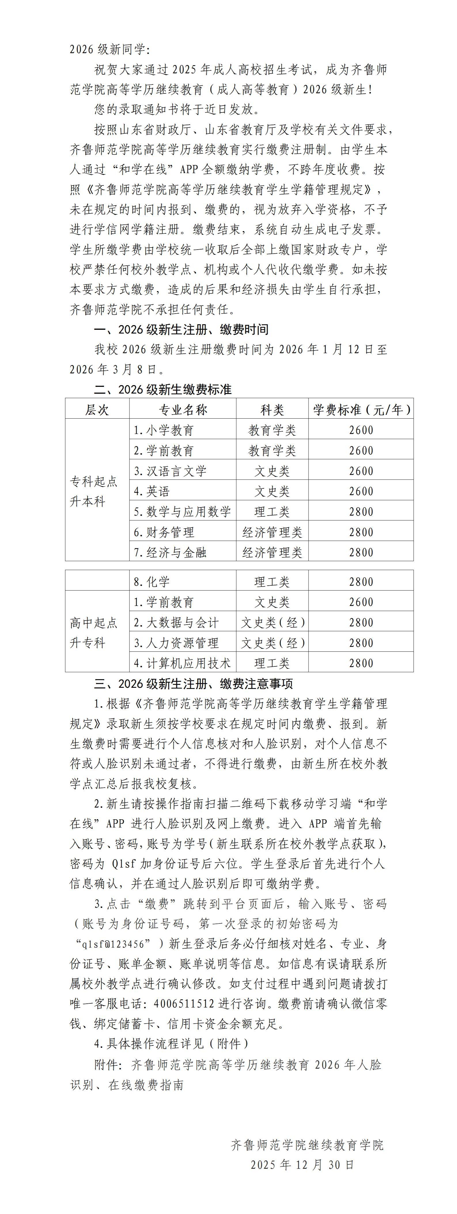 关于齐鲁师范学院高等学历继续教育2026级新生注册、在线缴费工作的通知